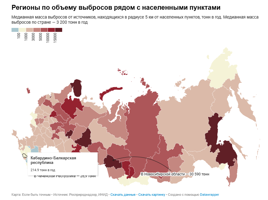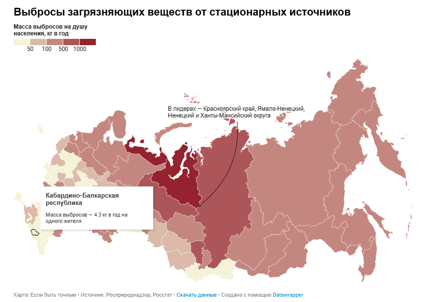 Кабардино-Балкария заняла первое место, за год вредные выбросы в республике сократились на 26,8% — удельные выбросы на человека за 2022 год составили 21,6 кг.
